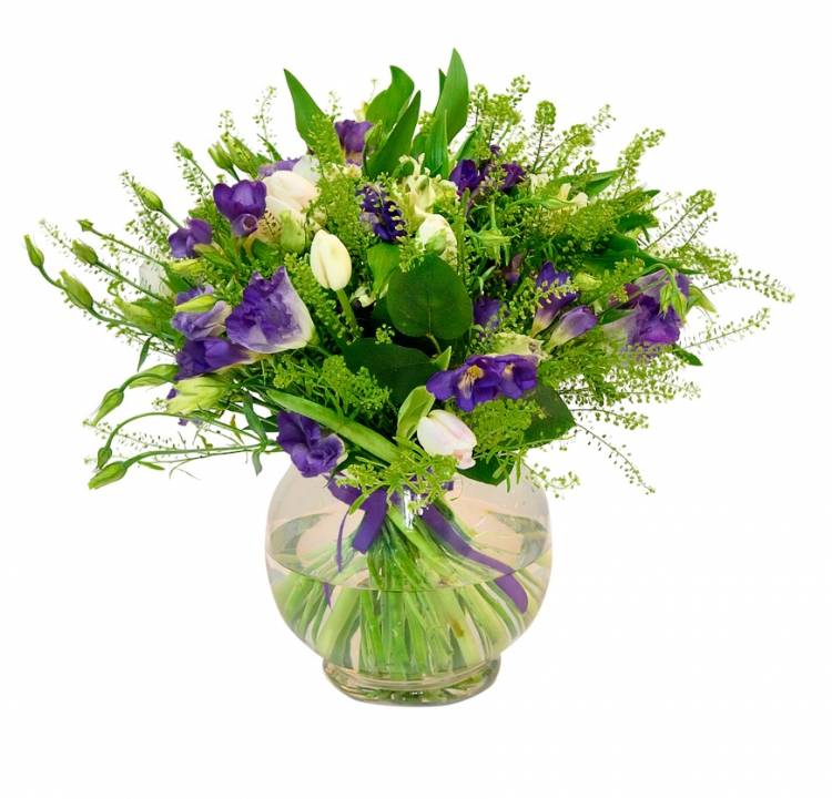 Этот букет – символ чистого и светлого чувства, прозрачного и хрупкого как сам кристалл. Считается, что белые тюльпаны символизируют искренность и нежность, а букет с такими цветами приносит счастье в любви. Фиолетовые лизиантусы также привносят в композицию гармонию и романтичность, являются мощным символом, характеризуя собой спокойствие, мир и процветание. Дополнительный шарм и загадочность привносят альстромерии и декоративный гринбелл.