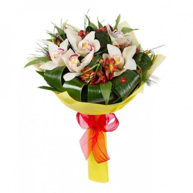 Букет «Моей милой» прекрасно подойдет в качестве подарка на первом свидании, ведь наверняка поможет продемонстрировать симпатию и завоевать расположение прекрасной дамы. Изящная цветочная композиция состоит из орхидей, символизирующих совершенство и элегантность, а также утонченных альстромерий, олицетворяющих чистоту и невинность. Обильное украшение из листьев бергаса делают букет еще более привлекательным, красочным и эффектным.