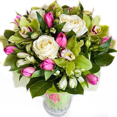 Такую роскошную композицию можно по праву назвать одой женской красоте. Белые розы восхваляют невинность и чистоту, а также позволяют без слов рассказать о своих нежных чувствах к избраннице. Хрупкая и элегантная орхидея продолжает песню о любви к дамам, символизирует мудрость, аристократичность и утонченность. В компании с игривыми розовыми тюльпанами, неординарными альстромериями и безграничной весенней зеленью они создают удивительно гармоничную комбинацию. Цветущий подарок покорит сердце дамы своим изяществом и тонким неповторимым ароматом. Подойдет такой букет не только для любимой девушки, но также для мамы или сестренки.